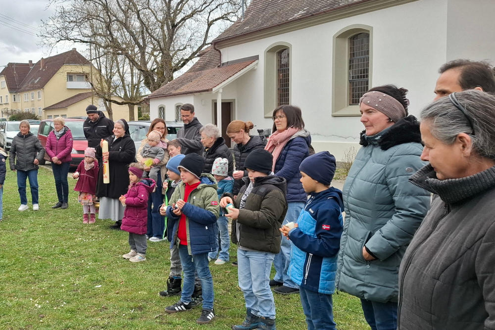 ​Gemeinschaft am Osterfeuer: Nach der Andacht und dem Basteln kamen alle Teilnehmer am Osterfeuer zusammen, das von Ortsvorsteher Matthias Locher entfacht worden war.
