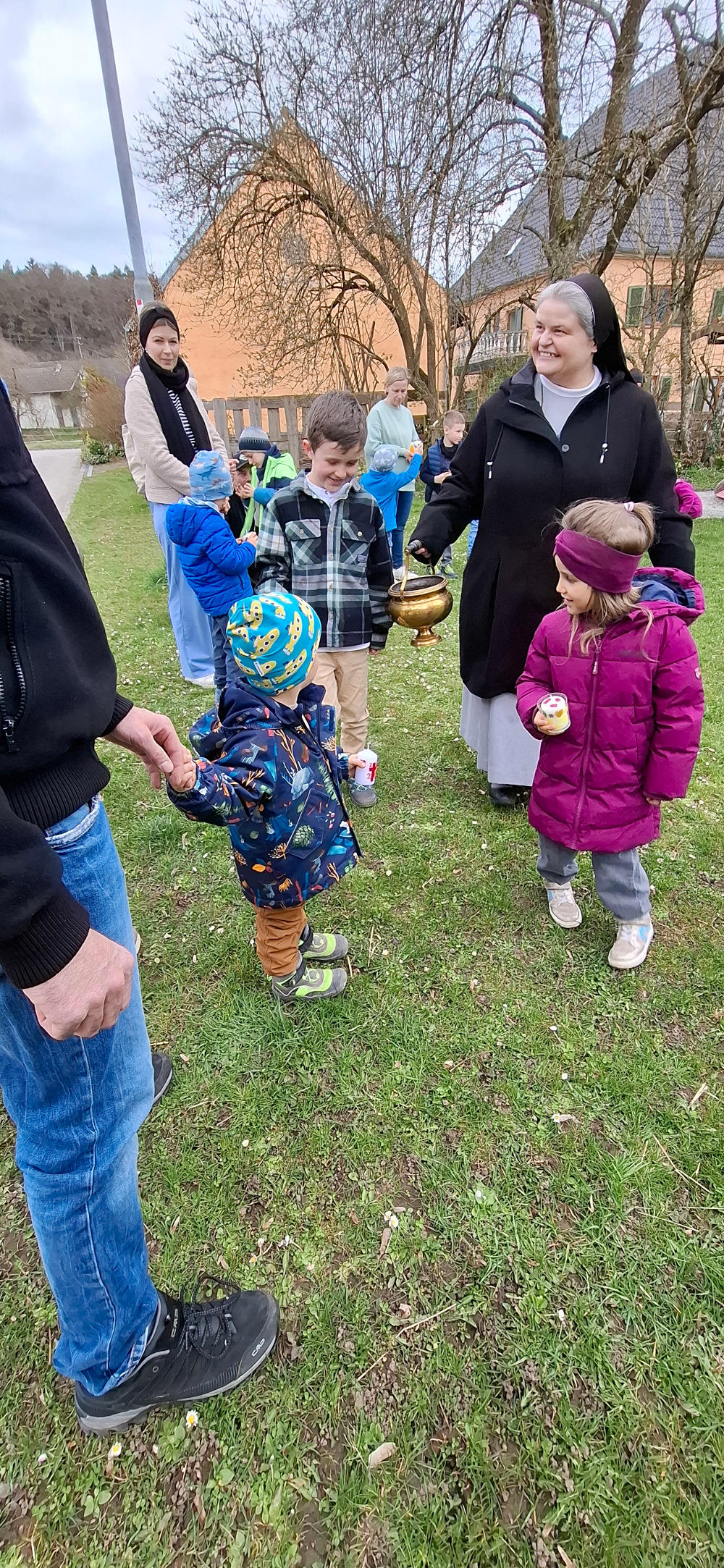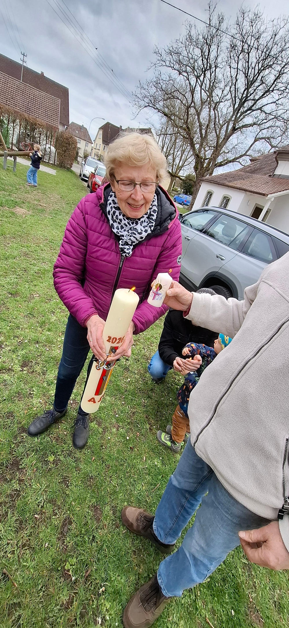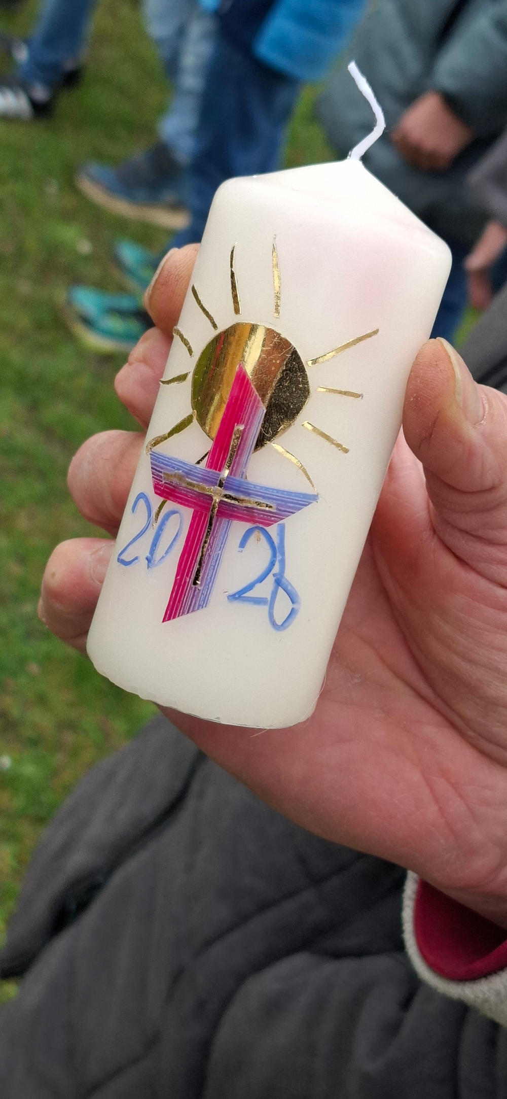 ​In einem symbolischen Akt der Lichtweitergabe durften die Kinder ihre selbst gestalteten Kerzen an der zuvor in der Kapelle geweihten Osterkerze entzünden.