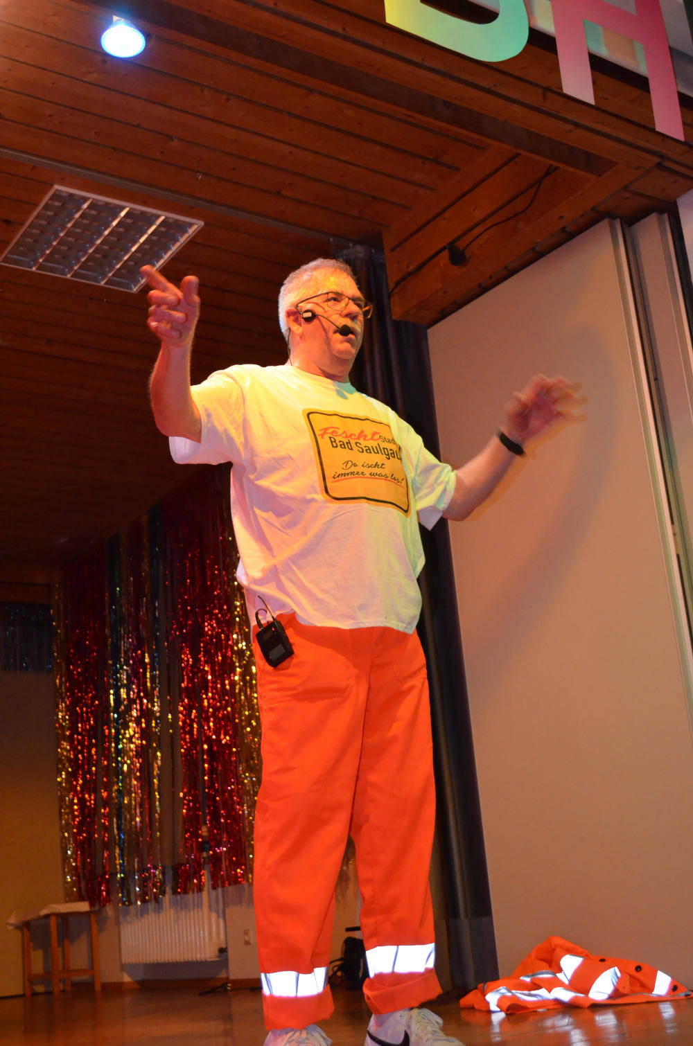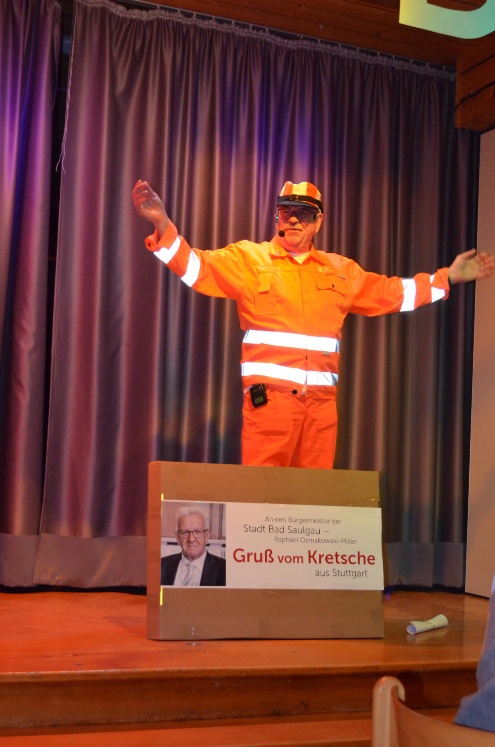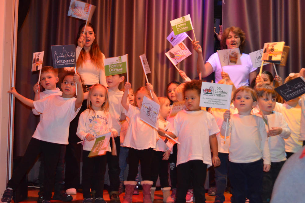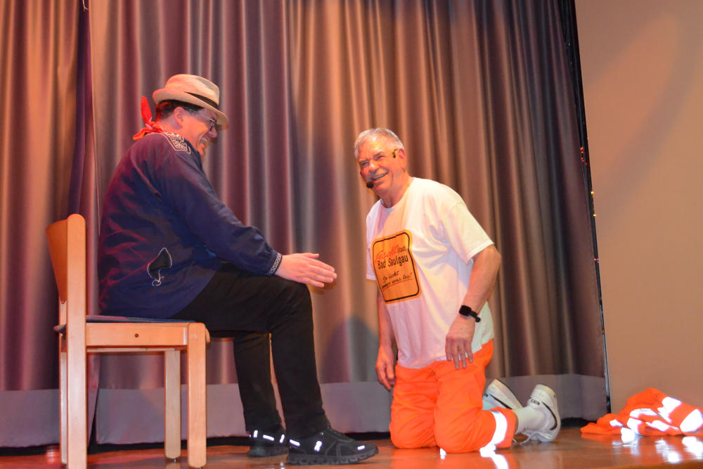 Den Auftakt machte Richard Frey höchstpersönlich: Als Bauhofmitarbeiter verkleidet, schilderte er den amüsanten „Leidensweg“ eines städtischen Angestellten, der von einem Fest zum nächsten eilt. Passend dazu marschierten die Kindergartenkinder mit bunten Fähnchen ein, die jedes Bad Saulgauer Fest repräsentierten, und rührten das Publikum mit ihrer Hymne „Bad Saulgau du schöne Stadt“.