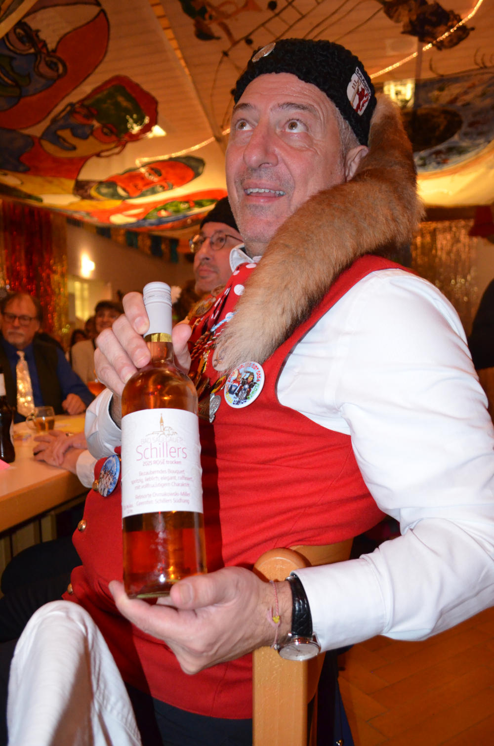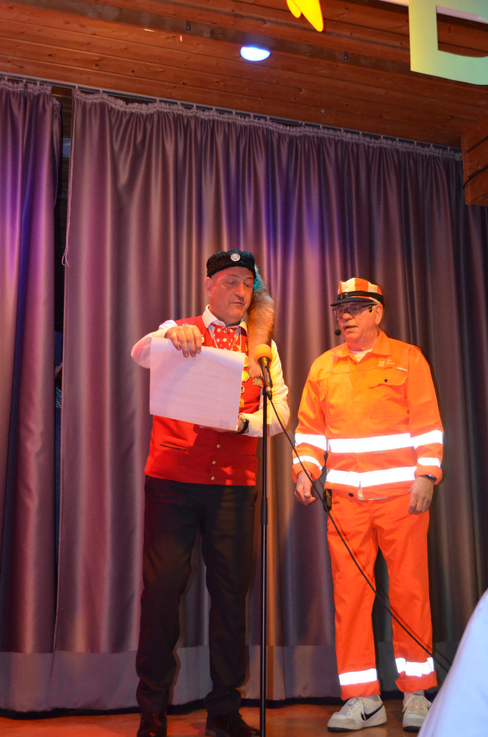 Ein besonderes Highlight war das Gewinnspiel mit Tücken: Die Teilnehmer auf der Bühne mussten spontan Grimassen schneiden – ganz im Stil der historischen Maske der Zennemacher von Alfons Scheck aus den 1950er Jahren. Auch Dekan Peter Müller und Bürgermeister Raphael Osmakowski-Miller ließen es sich nicht nehmen, beim traditionellen „Wurstschnappen“ für allgemeine Belustigung zu sorgen.