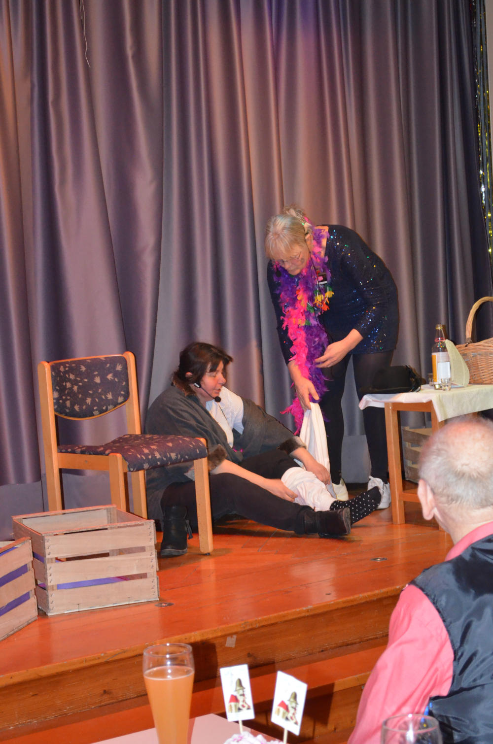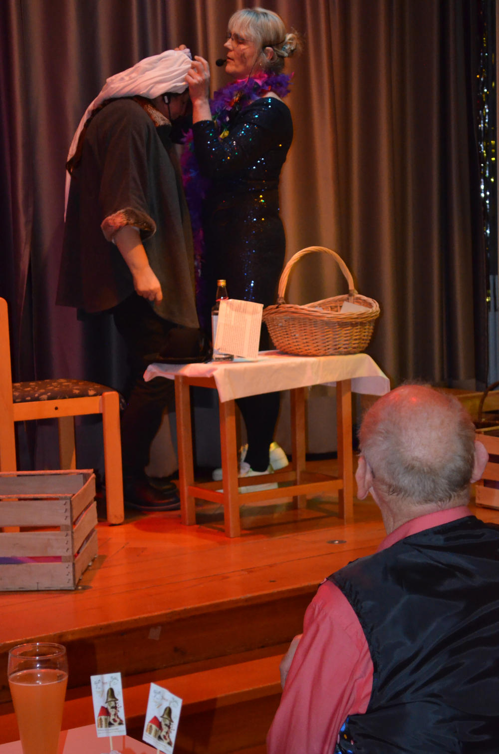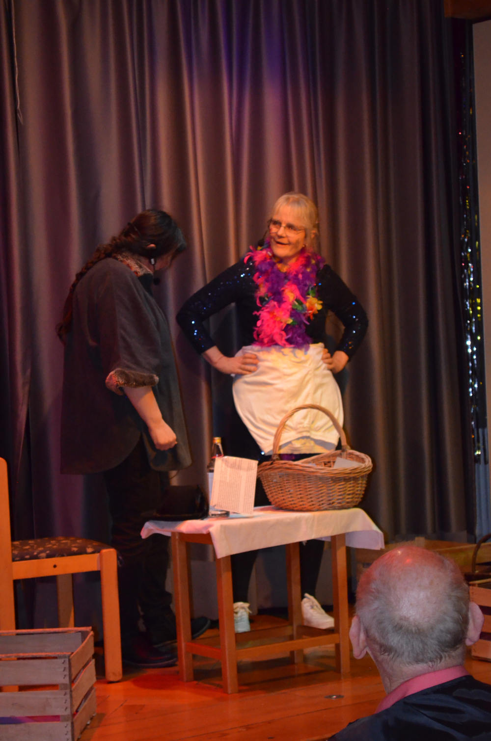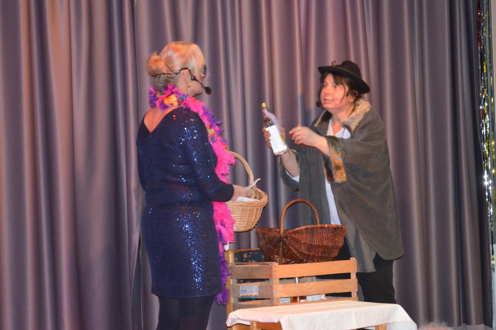 Den „Ländlemarkt“ durchstöberten Teresa Harsch und Pia Maucher auf der Suche nach einem Geschenk für Dekan Peter Müller, der in letzten Jahr nicht nur seinen 50. Geburtstag, sondern auch sein 20-jähriges Priesterjubiläum feiert. Nach vielen Fehlversuchen fanden sie das „perfekte“ Präsent: Eine weiße Unterhose vom Typ „Liebestöter“, die sich im Sketch als wahres Multitalent – vom Schal bis zum Tauzieh-Seil – erwies.