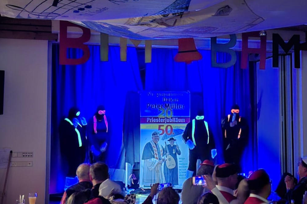 Rührend wurde es bei der Darstellung der nächtlichen Banner-Aktion am Pfarrhaus. Im stimmungsvollen Schwarzlicht zeigten B. Möhrle, S. Engelhardt, I. Mangler und V. Falcicchio die Szene, in der die Mutter des Dekans durch das laute Poltern der Gratulanten geweckt wurde, während der Jubilar selbst im Halbschlaf nur zur Ruhe mahnte.