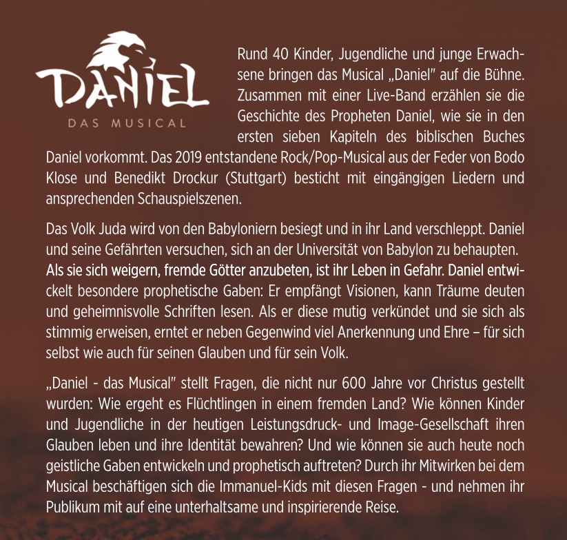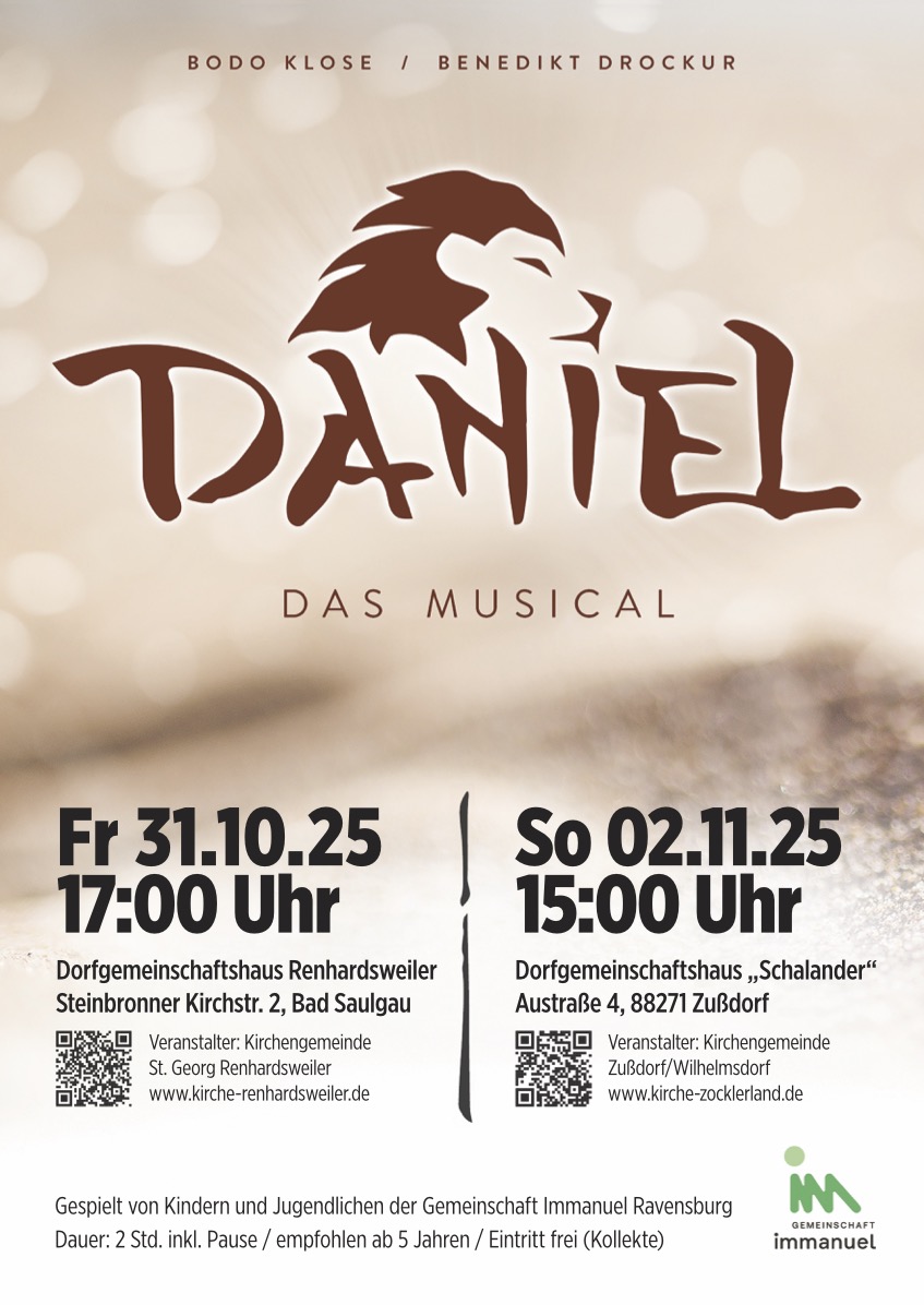 Am Freitag, 31.10.2025 17:00 Uhr präsentiert die Gemeinschaft Immanuel Ravensburg im Dorfgemeinschaftshaus Renhardsweiler das Kinder-und Jugendmusical „Daniel- das Musical“. Rund 40 Kinder und Jugendliche erzählen die Geschichte des Propheten Daniel, der mit seinem Volk nach Babylon verschleppt wird und dort durch seinen Mut, seine Weisheit wie auch durch seine Gabe, Rätsel zu lösen, Träume zu deuten und Ereignisse zu prophezeien, bestehen kann. Ein Lebensbeispiel und Vorbild auch für junge Menschen von heute, die in einem nicht- oder andersgläubigen Umfeld ihren Glauben, ihr Christsein leben wollen.