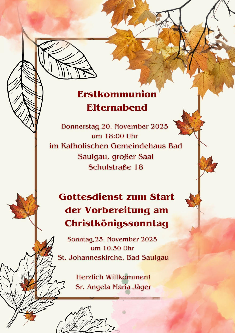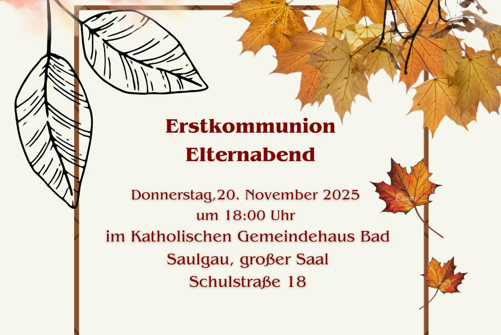 Der erste Elternabend für die Eltern der Erstkommunionkinder 2026 findet am Donnerstag, 20.11.2025 im Kath. Gemeindehaus statt.