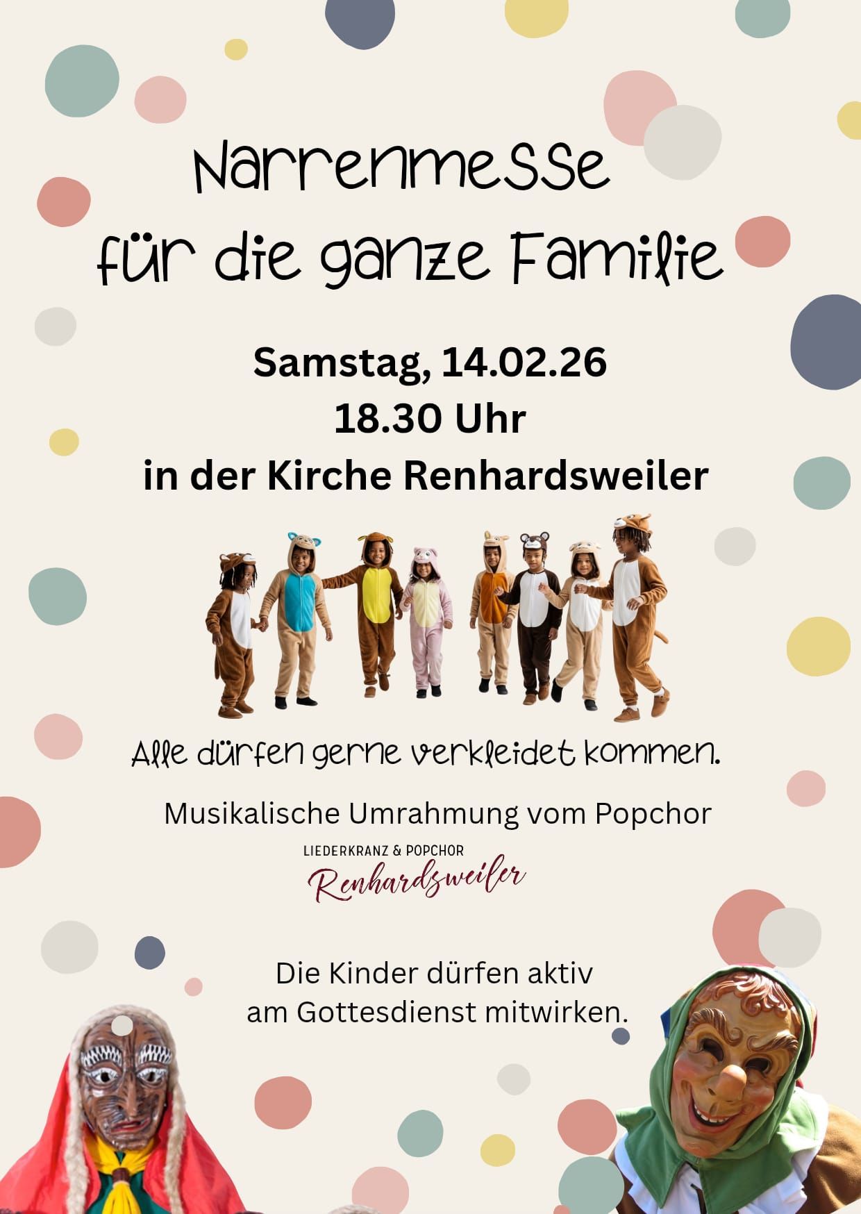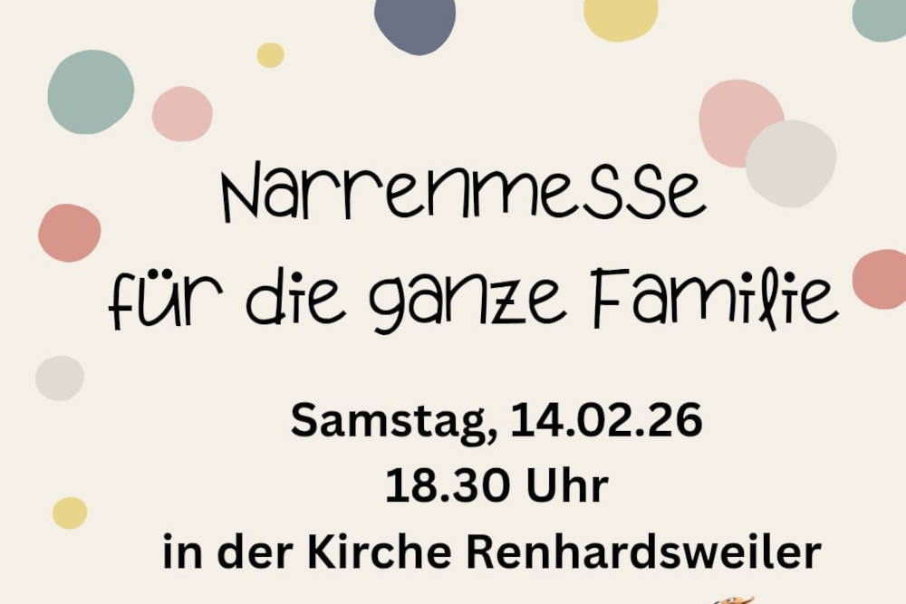 Am Samstag dem 14.02. findet um 18:30 Uhr in der Pfarrkirche Renhardsweiler die Narrenmesse statt. Herzliche Einladung an alle!
